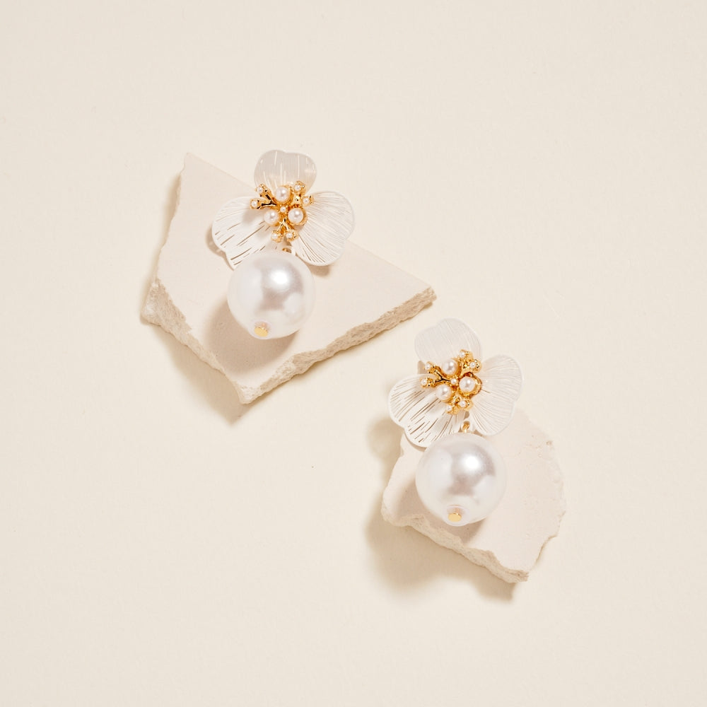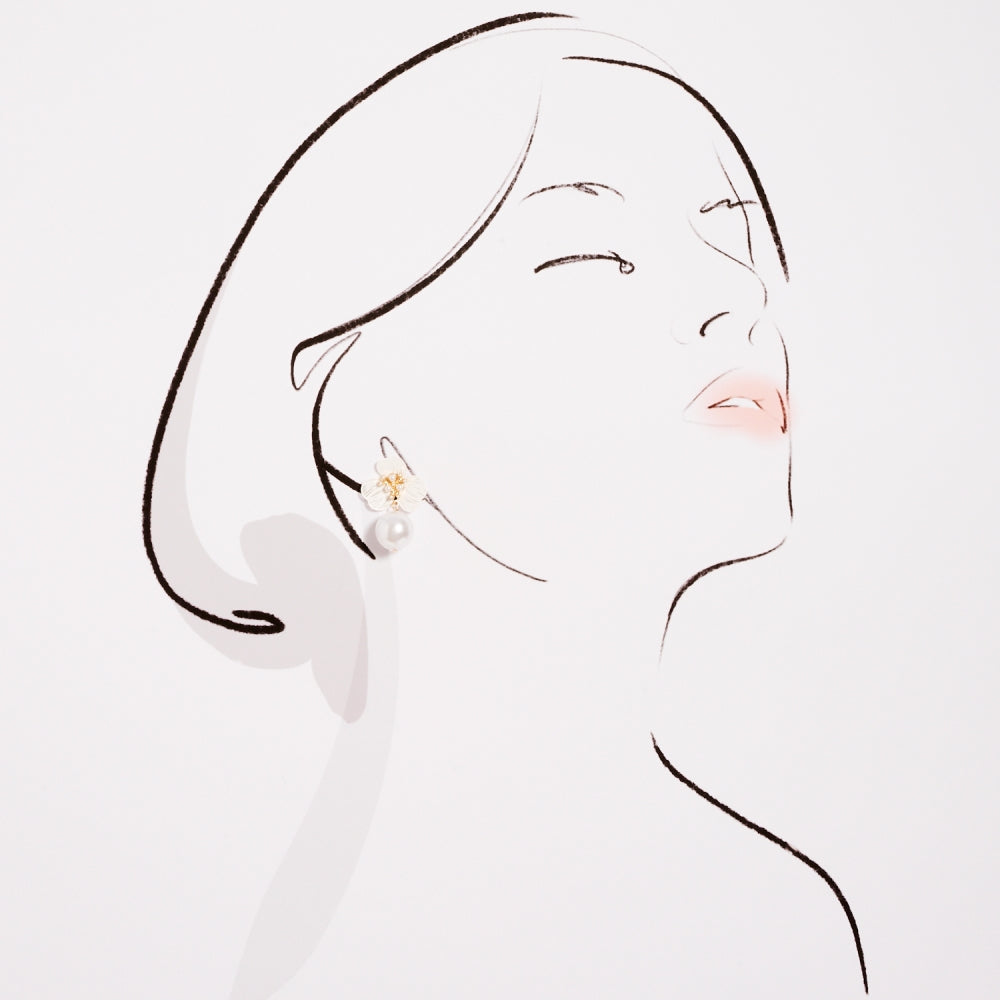 A pearl-centered flower sits at the top of this earring, offering a romantic and polished look. The linked pearl ball adds dimension and creates a graceful drop effect. Perfect for customers who love subtle floral pieces with a refined finish.