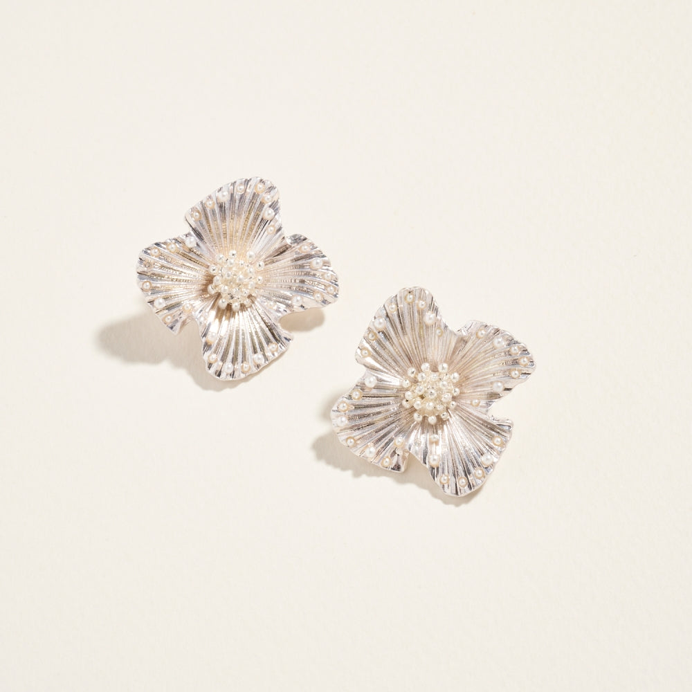 1.25 Inch Flower Pearl Metal Post Earrings Jewelry