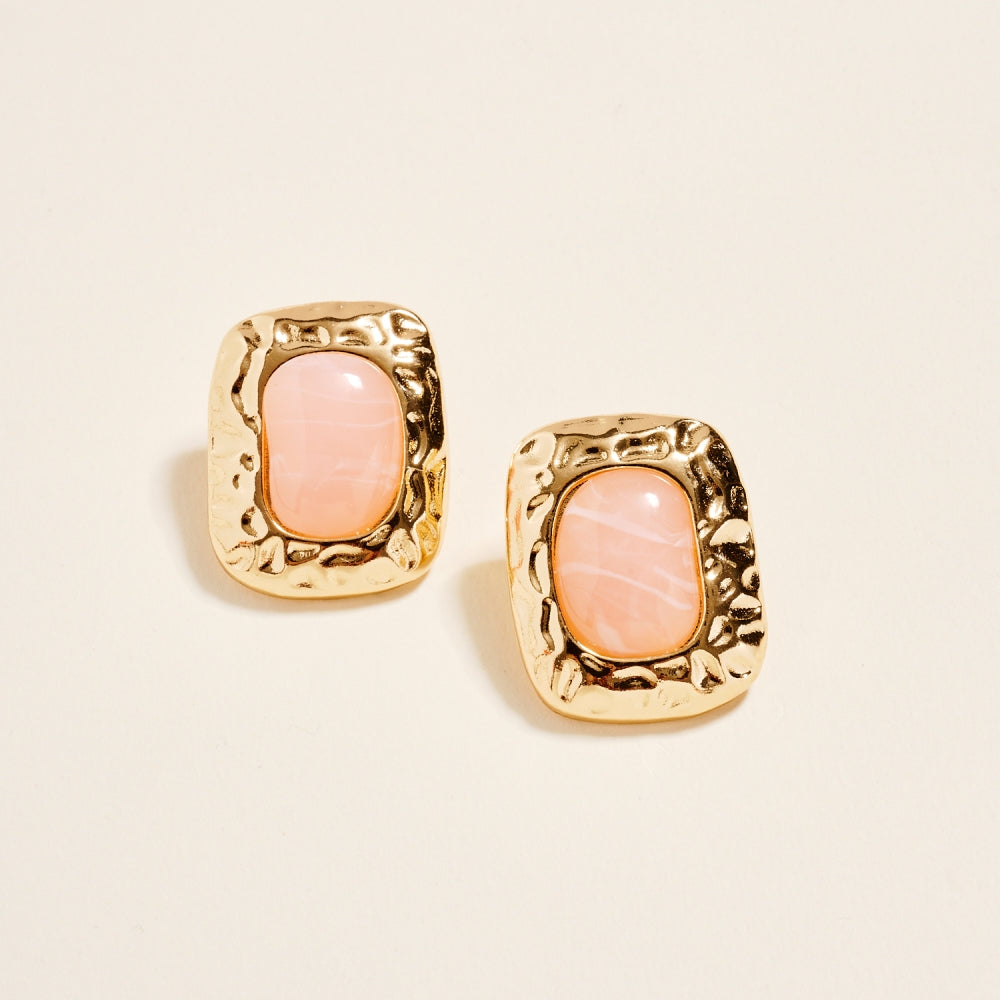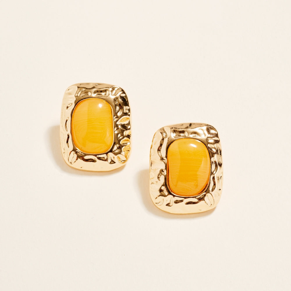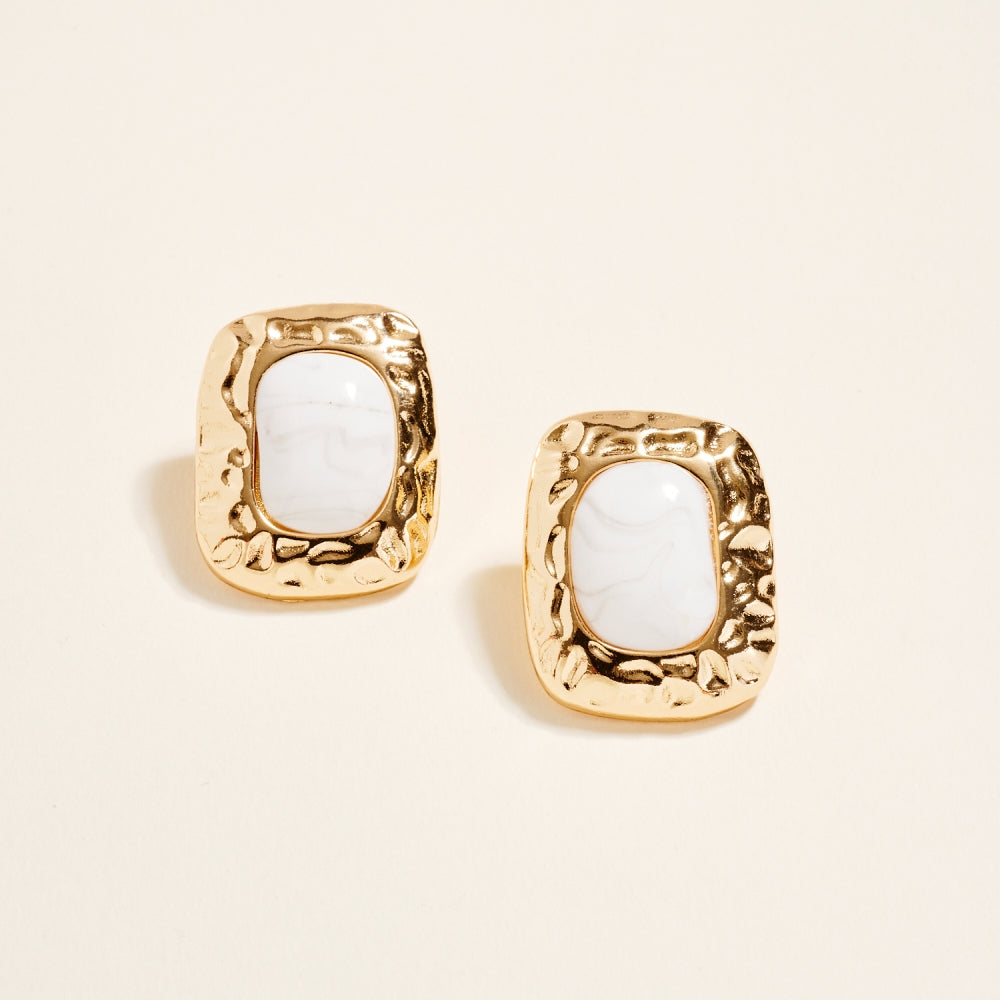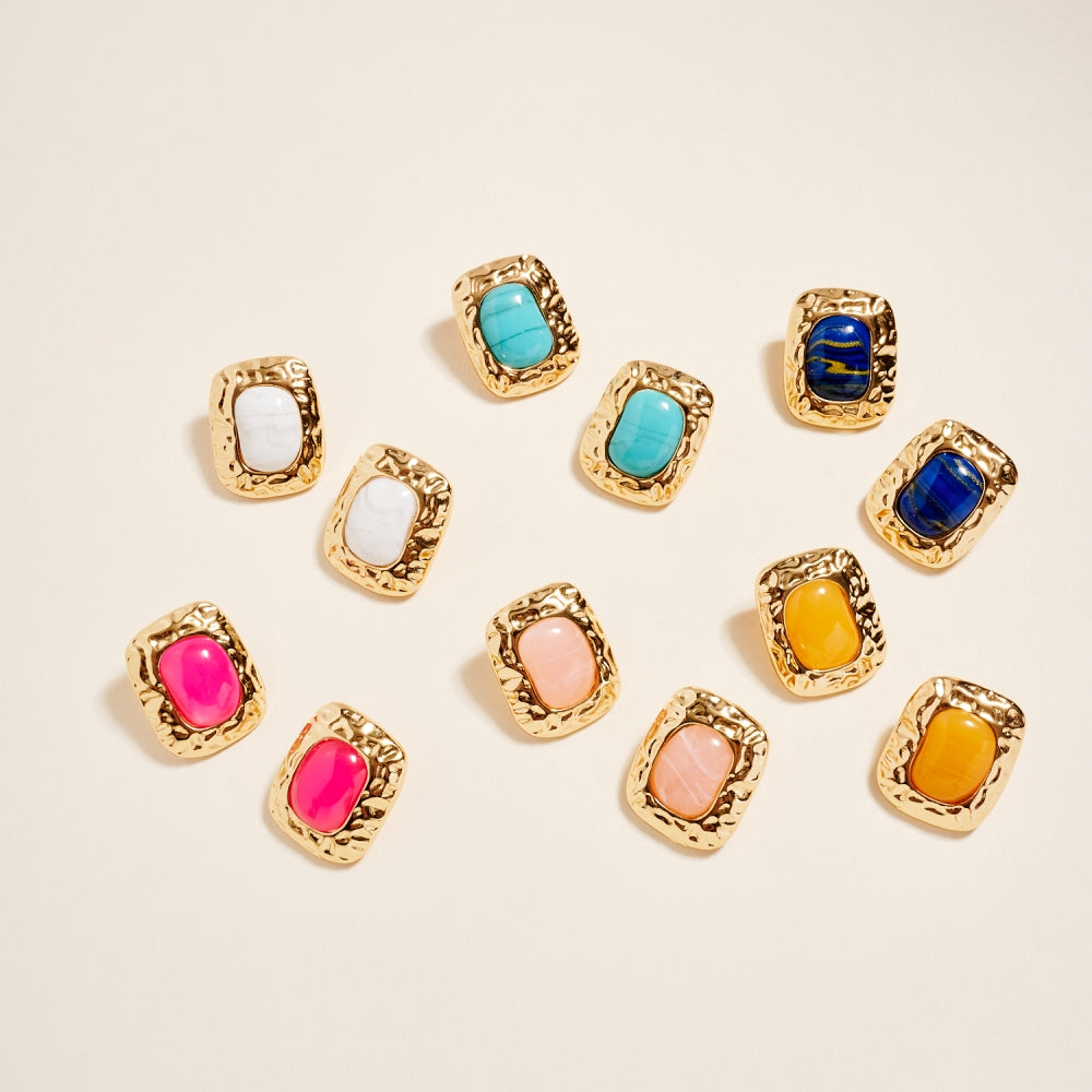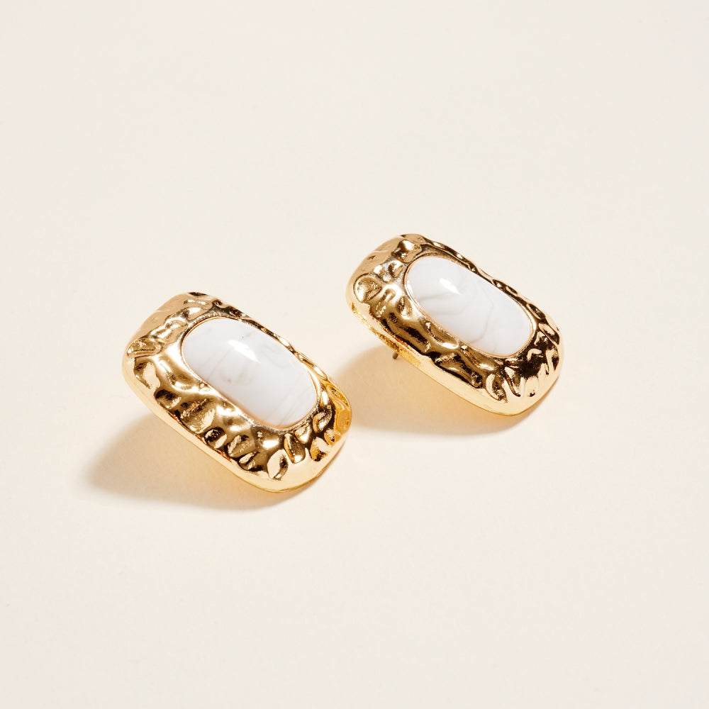 These post earrings feature a 1.25 inch hammered metal frame that surrounds a single marbled resin stone for a vintage inspired look. The mix of smooth resin and textured metal adds dimension and balance. A simple statement piece that works for both everyday and dressed up styles.