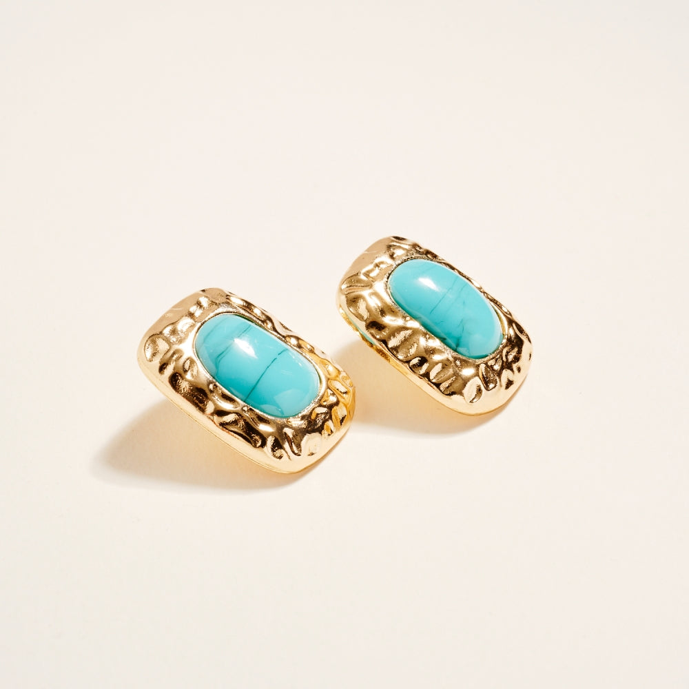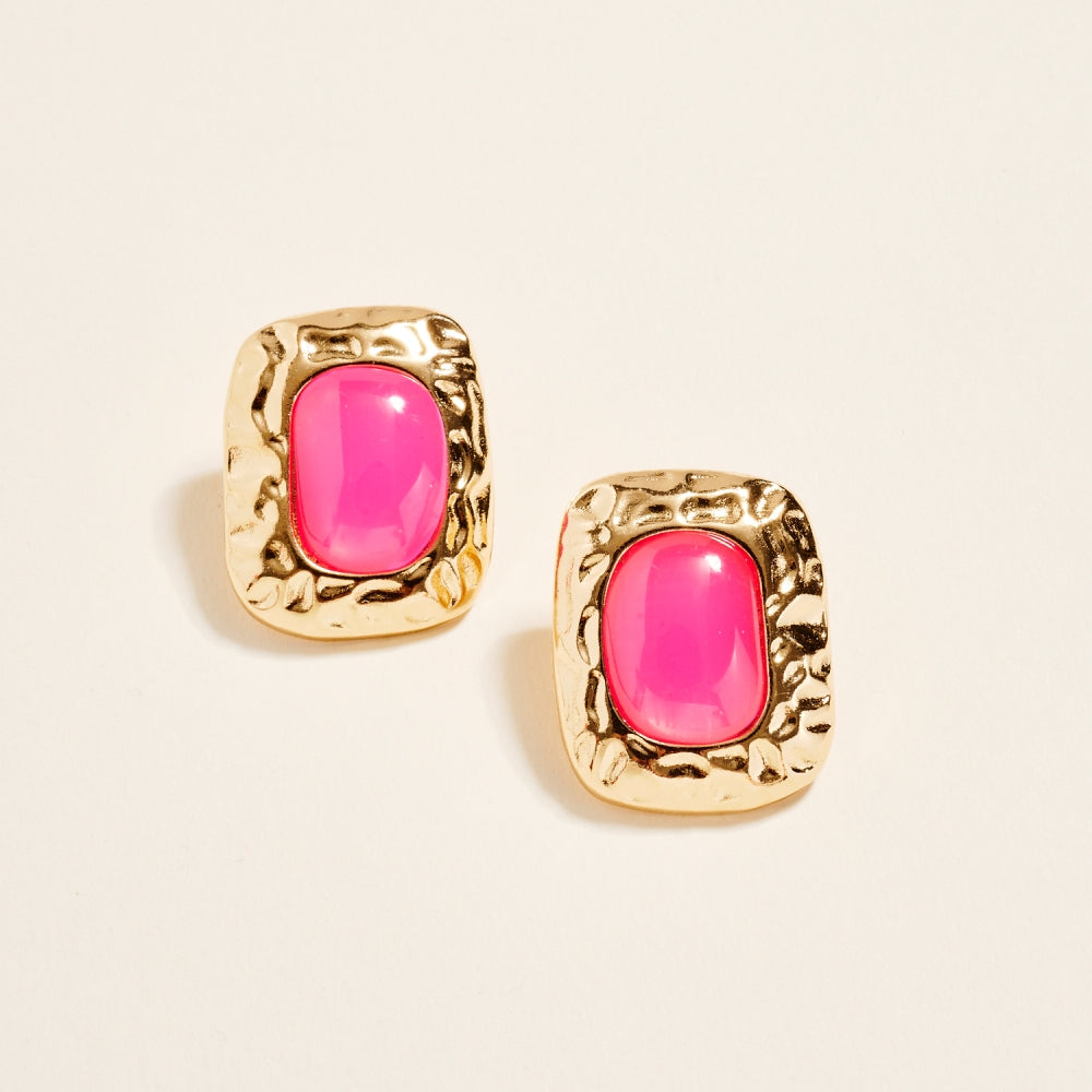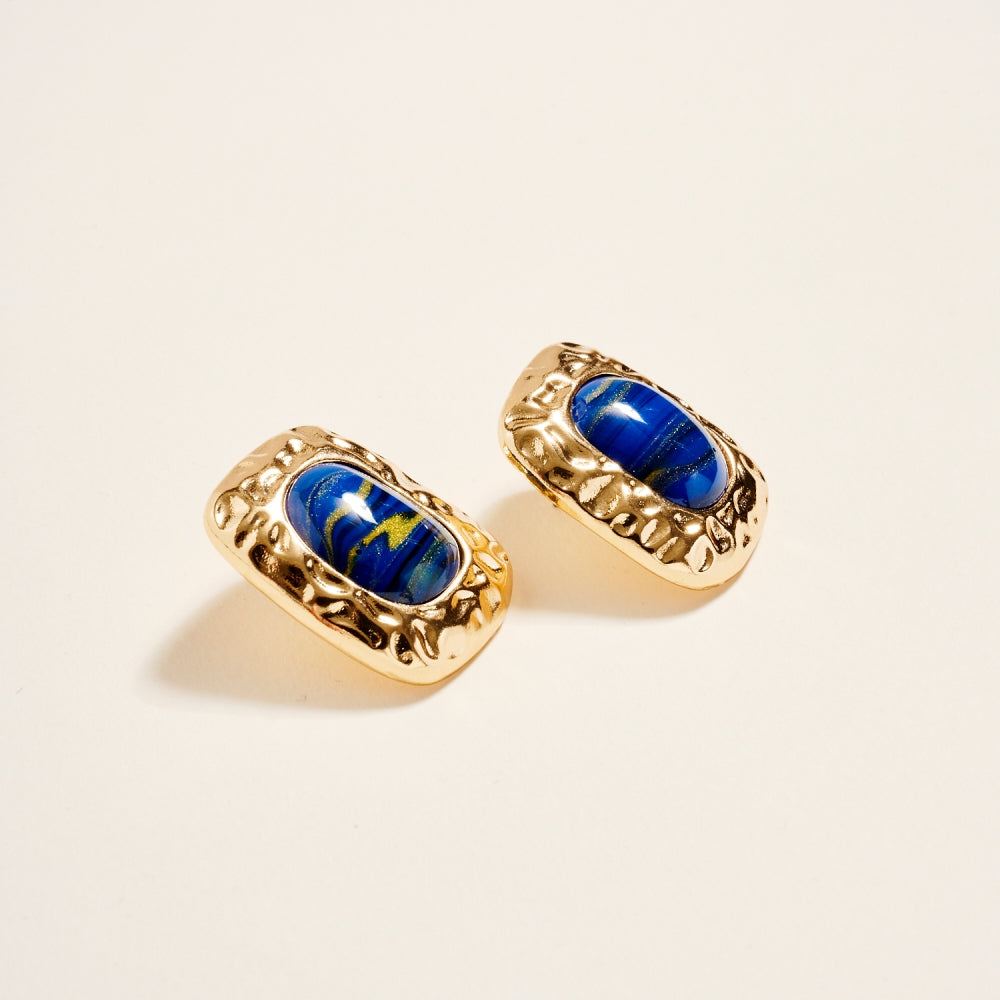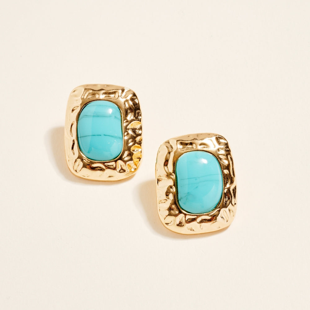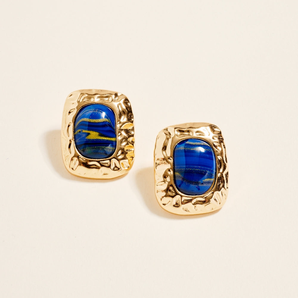 These post earrings feature a 1.25 inch hammered metal frame that surrounds a single marbled resin stone for a vintage inspired look. The mix of smooth resin and textured metal adds dimension and balance. A simple statement piece that works for both everyday and dressed up styles.