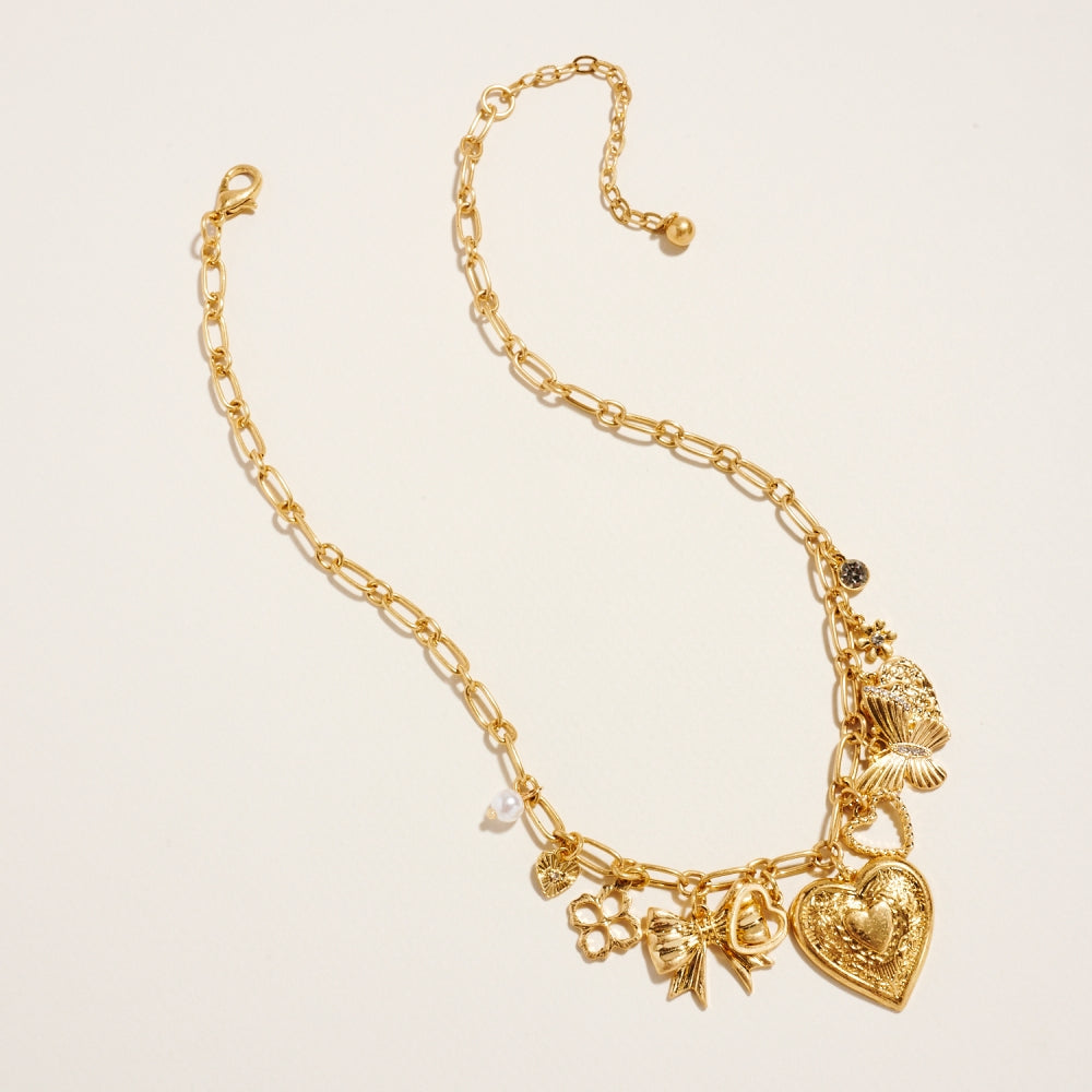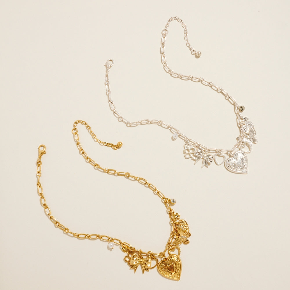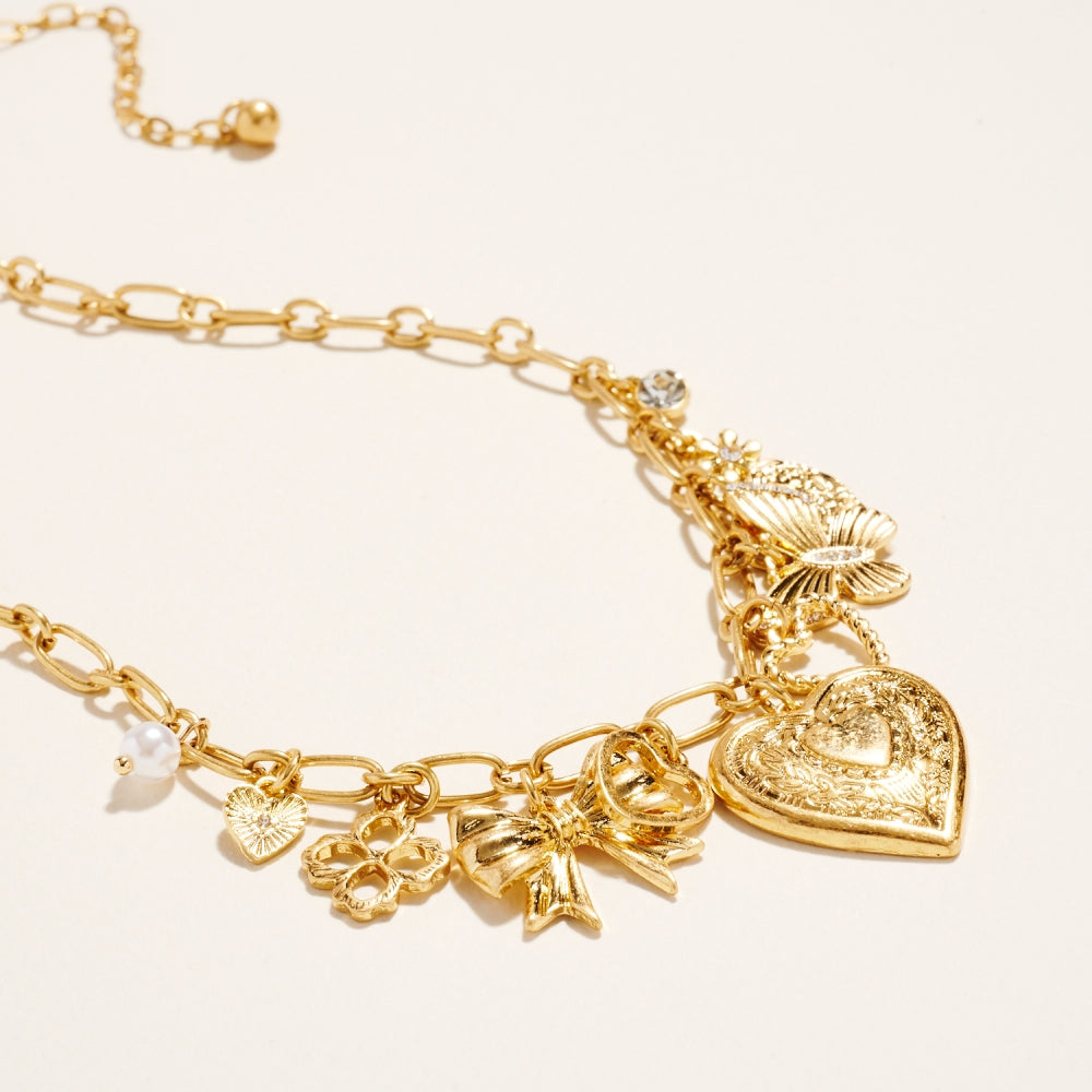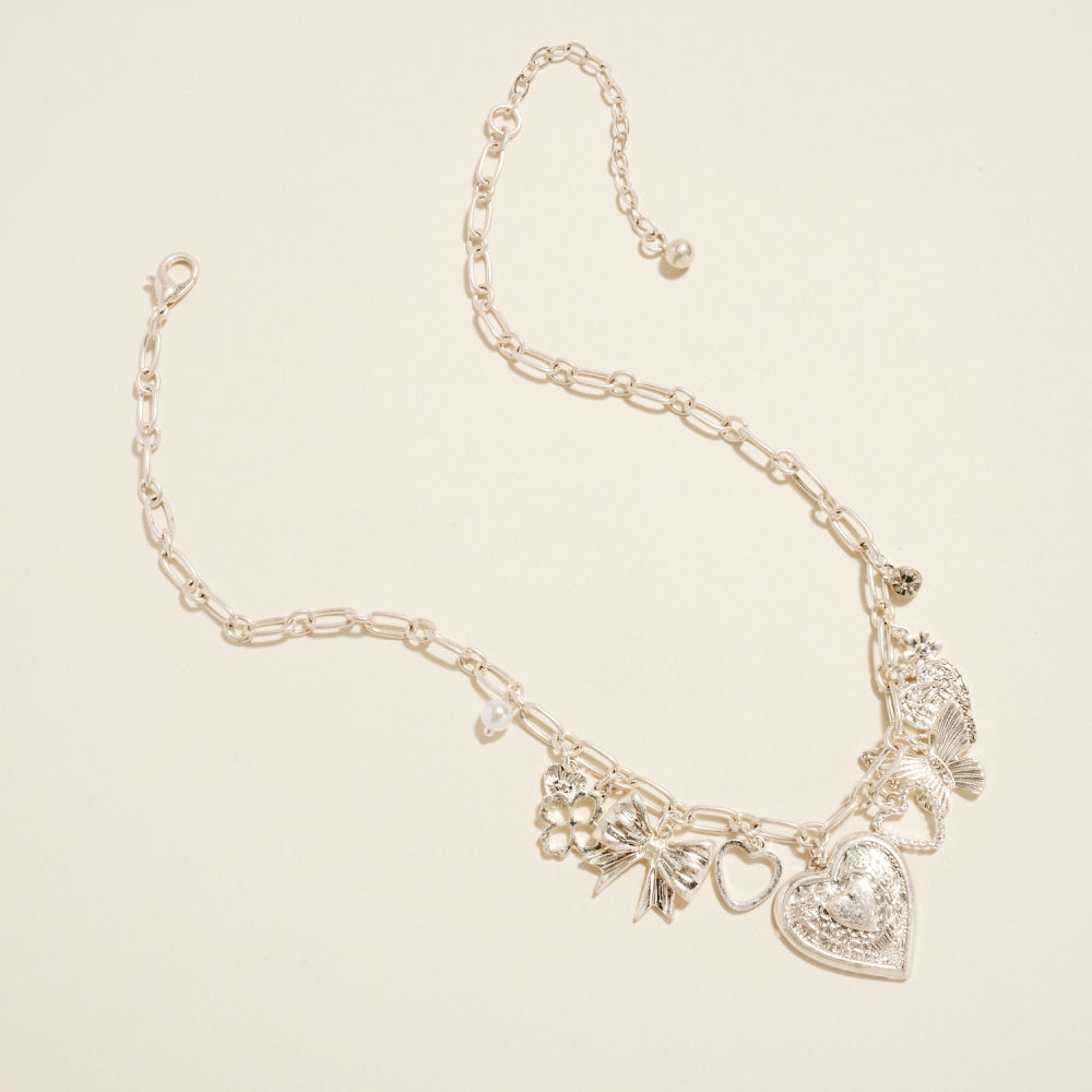 Celebrate love with this delicate necklace designed with romantic charms including a heart, bow, and butterfly. A meaningful Valentine’s Day gift to treasure year-round.