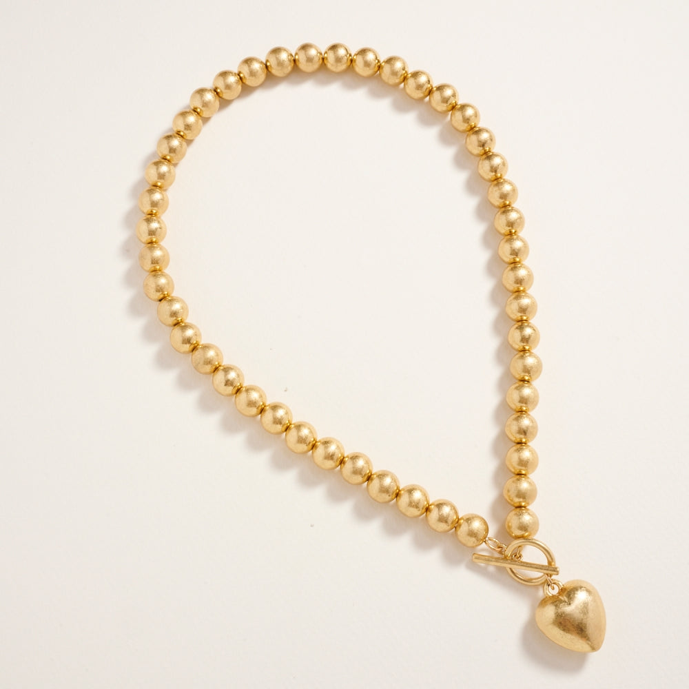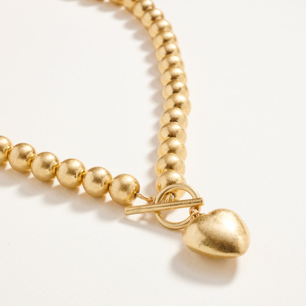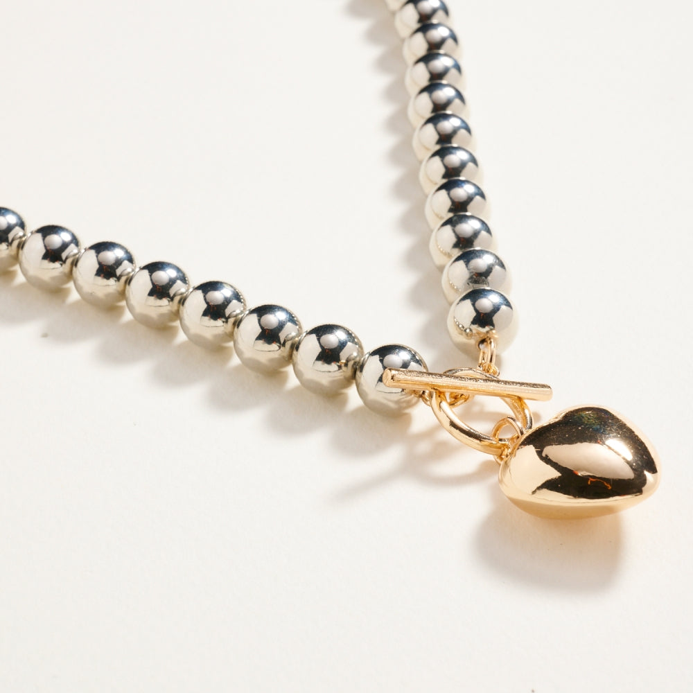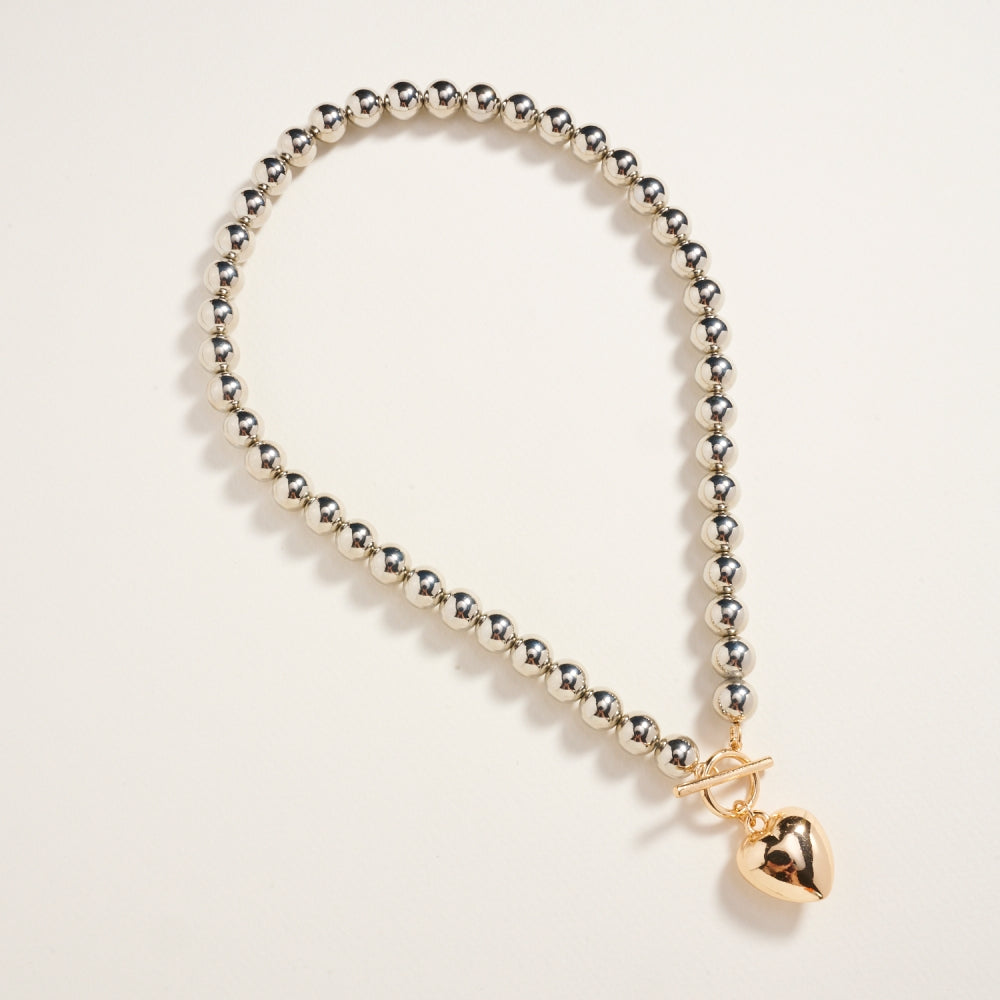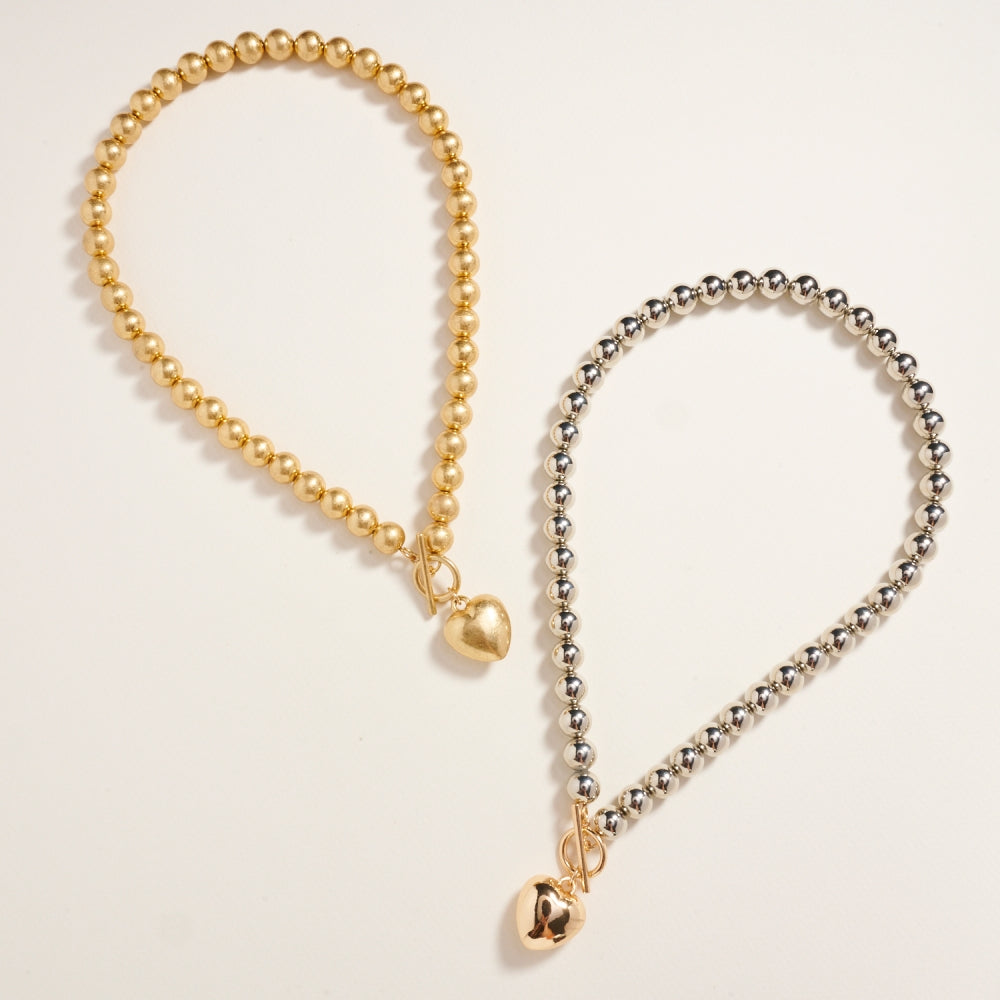 Shine with timeless charm in this 17-inch metallic bead necklace featuring a puffy heart pendant. Its polished finish and playful design make it a standout accessory for any occasion.