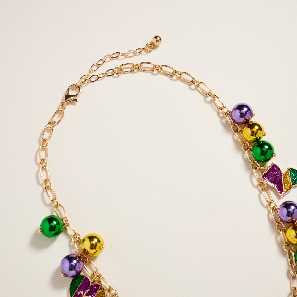 Bring the spirit of Mardi Gras to your look with this 18-inch bead chain necklace. A mix of colorful beads and whimsical charms captures the joy of carnival season, making it a must-have for festive fashion lovers.
