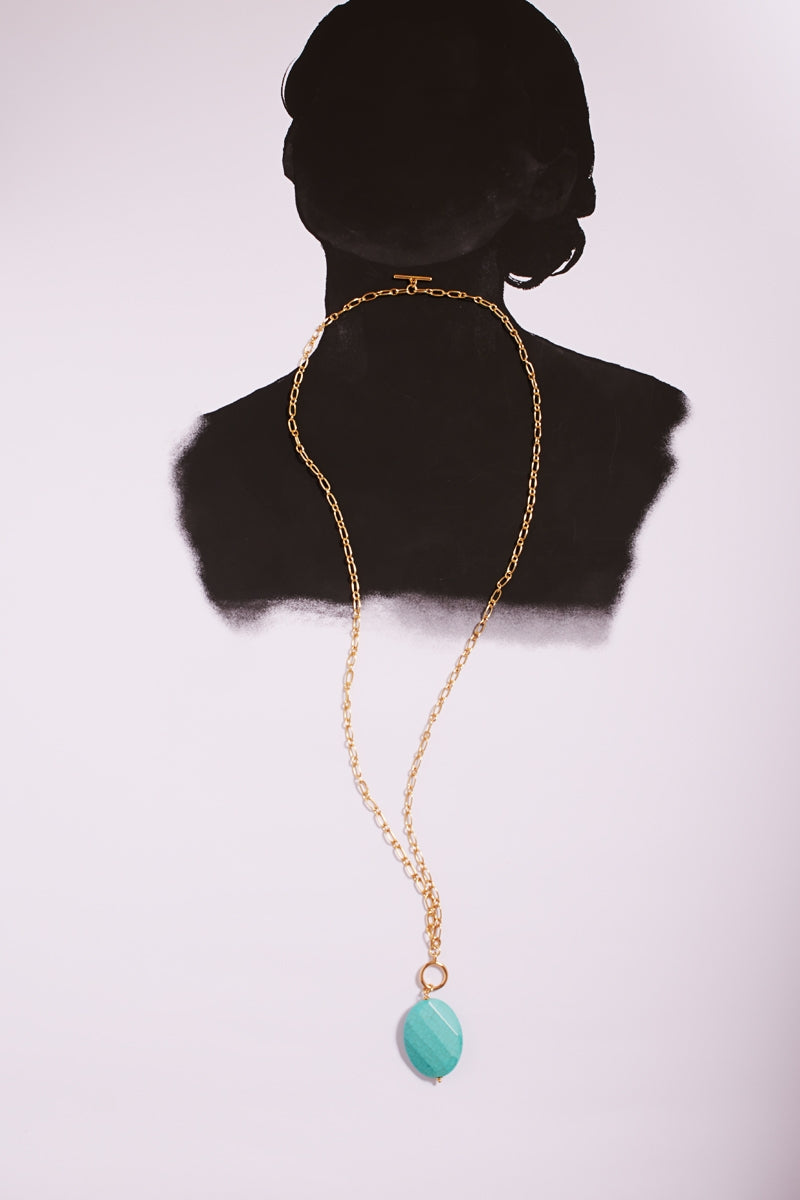 Enhance your outfit with our elegant 18 inch 18kt gold plated brass chain, featuring a waved oval shaped blue lace stone pendant. This short necklace adds a touch of sophistication to any look. Crafted with high-quality materials for lasting beauty.