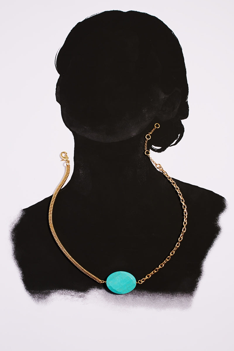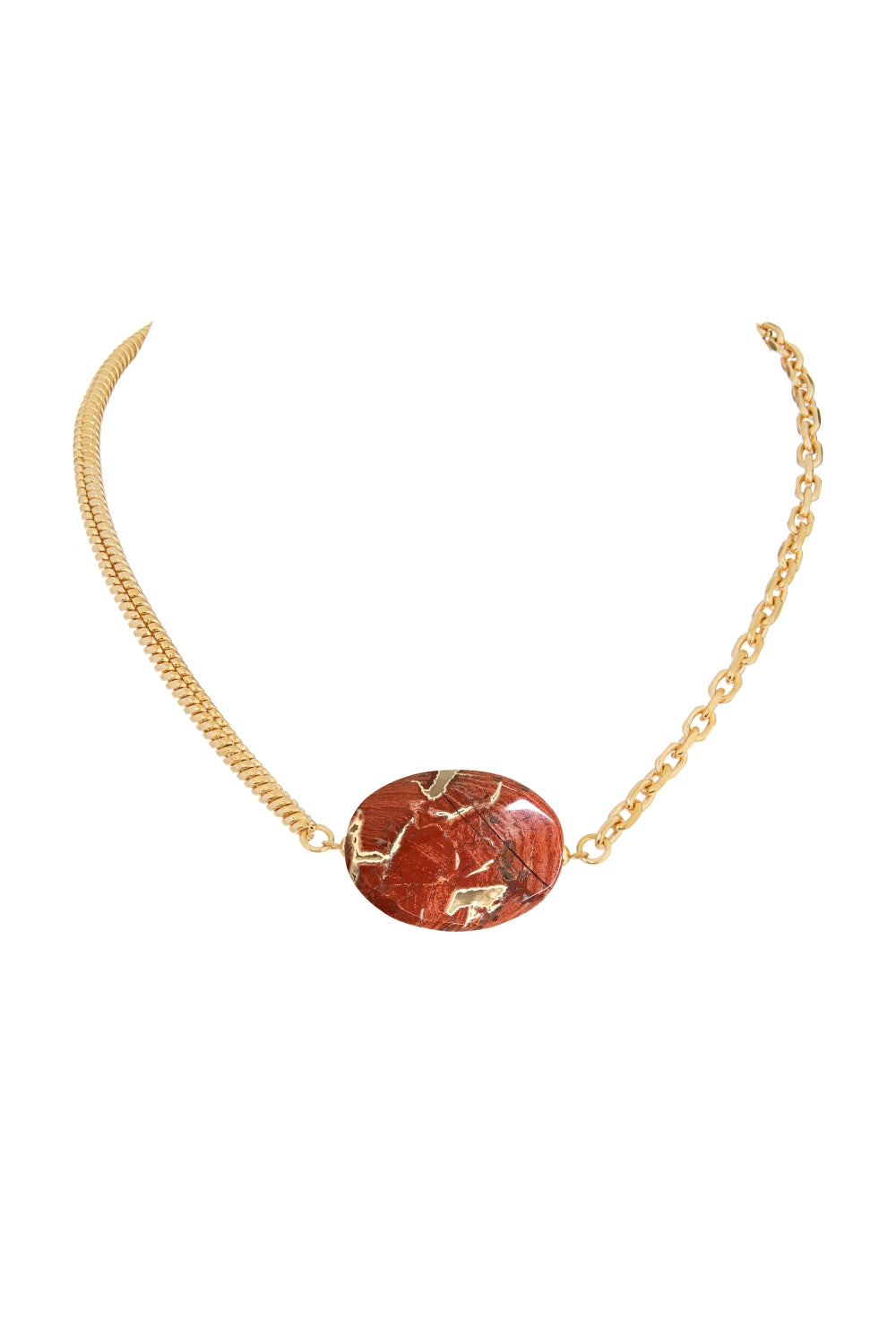 This 18-inch necklace features an 18K gold-plated brass chain paired with a 30x40mm waved oval stone, creating an elegant and timeless piece. The sophisticated design complements any outfit, adding a touch of luxury to your jewelry collection.