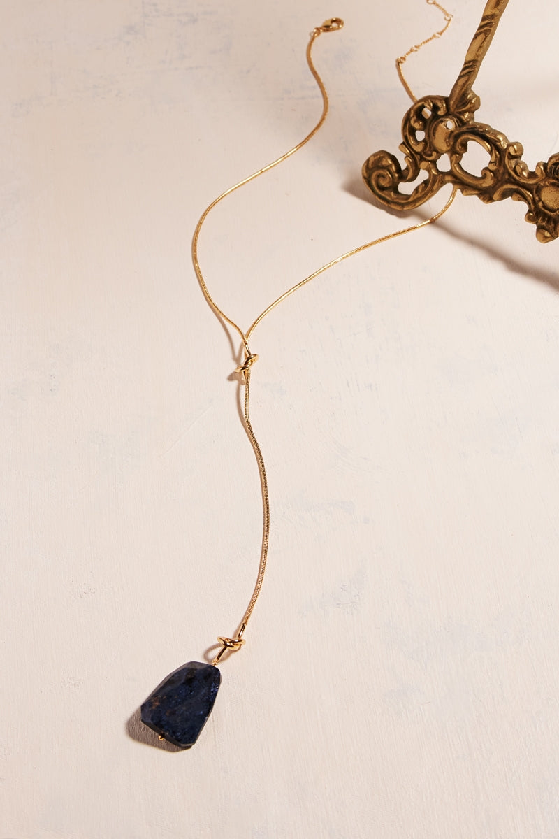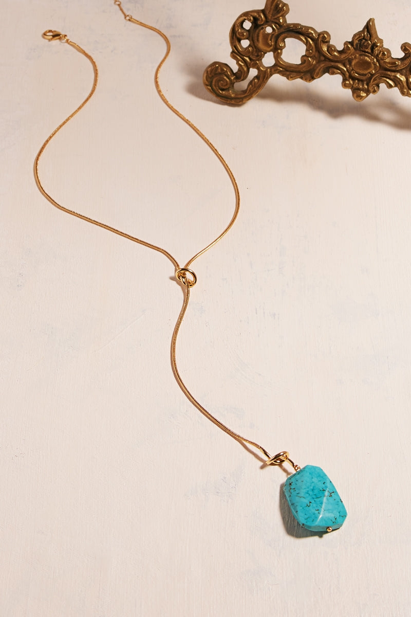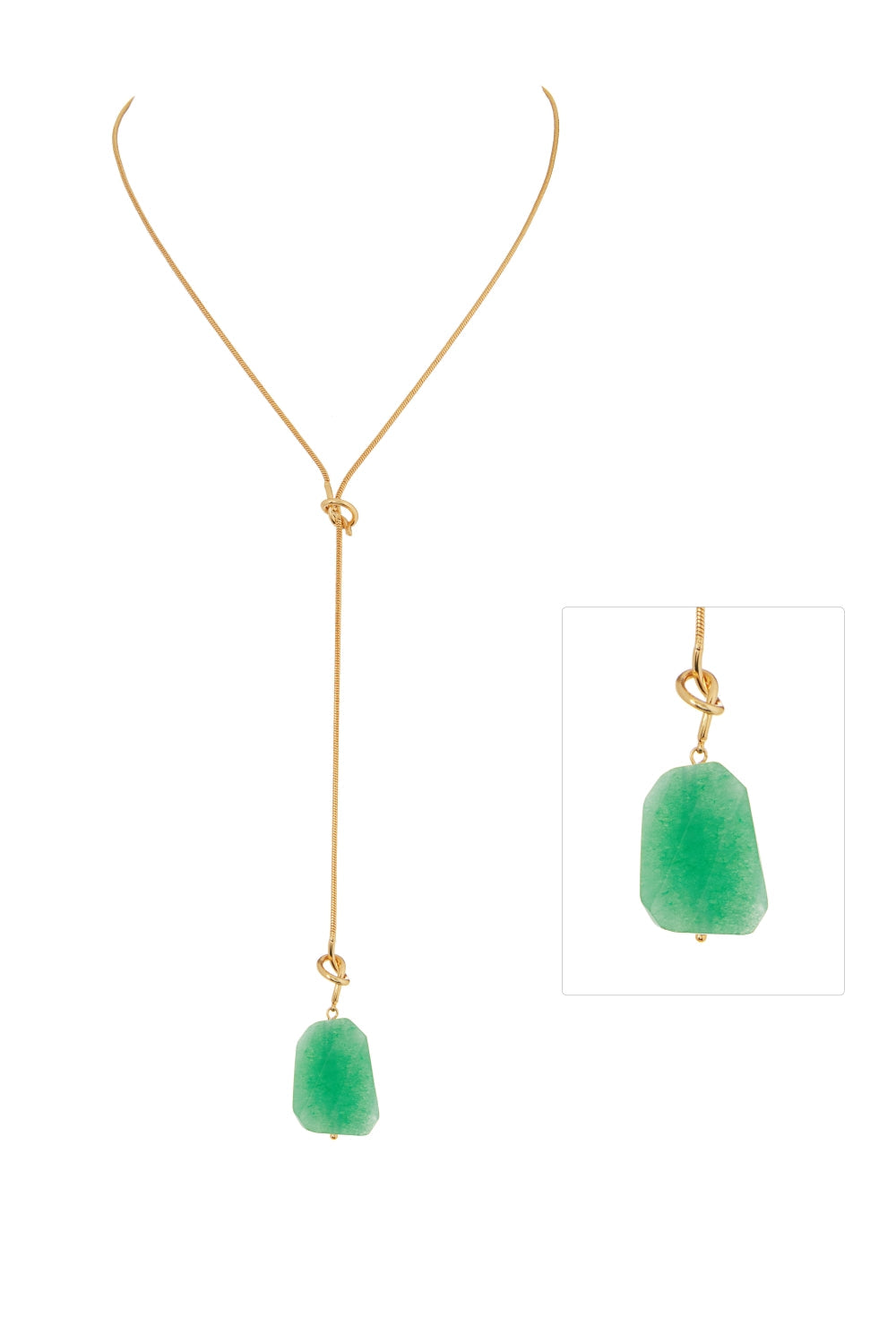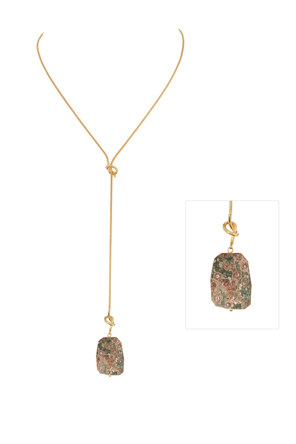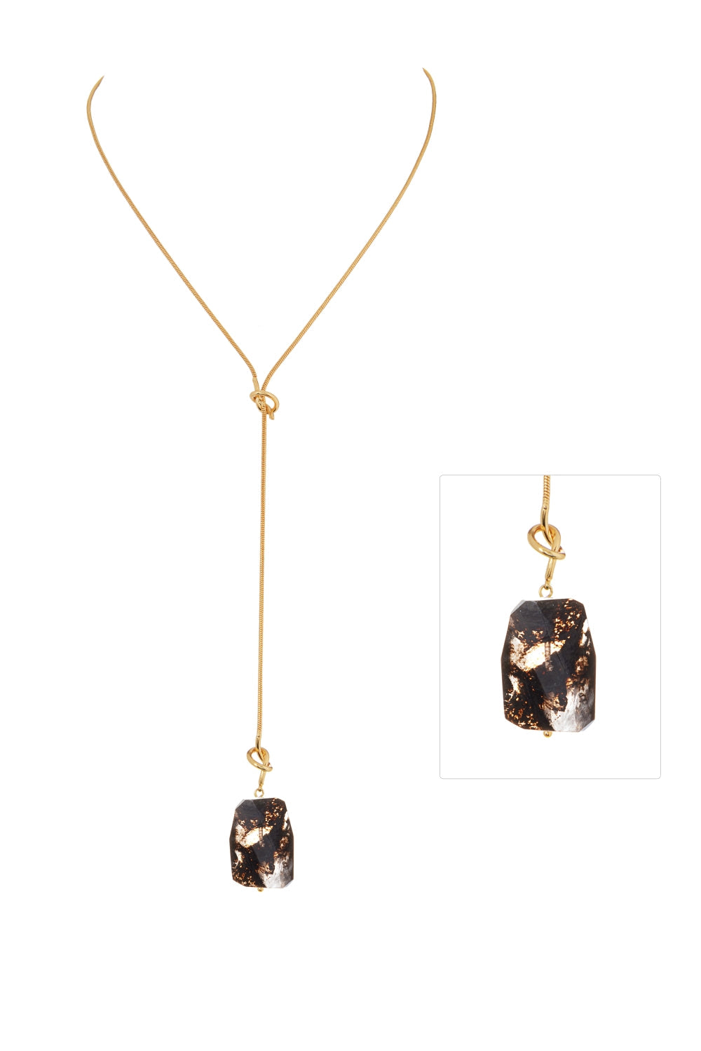 Featuring an 18-inch 18K gold-plated brass chain and a striking 22x30mm waved-cut stone, this unbalanced Y-shape necklace blends sophistication with modern elegance. Its unique design complements any attire, offering a refined contemporary look.