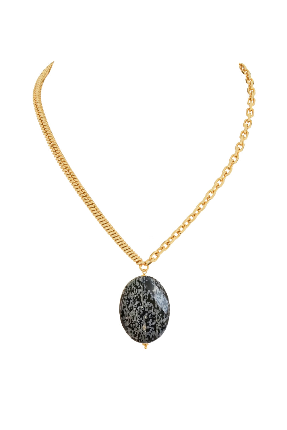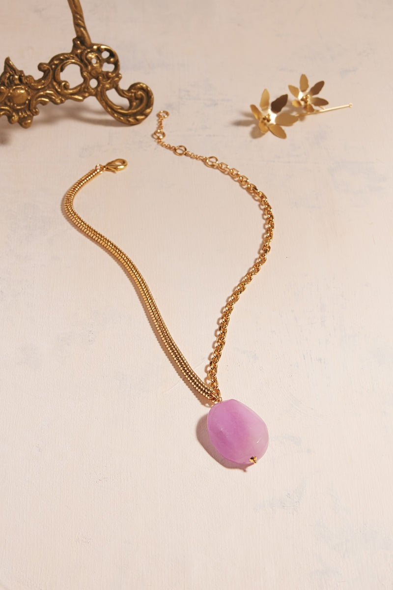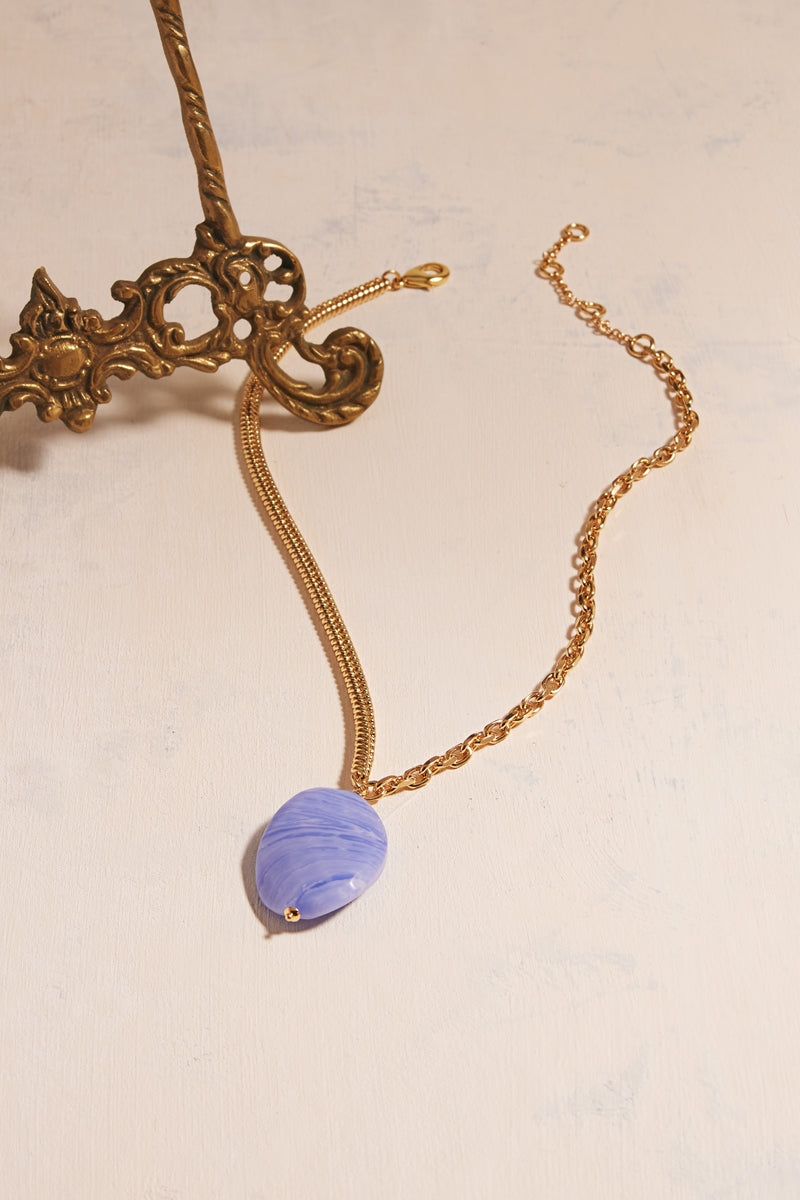 This short necklace features an 18-inch, 18K gold-plated brass chain and a unique 30x40mm waved oval stone pendant. The quality gold plating ensures lasting shine, and the modern pendant adds an elegant touch.